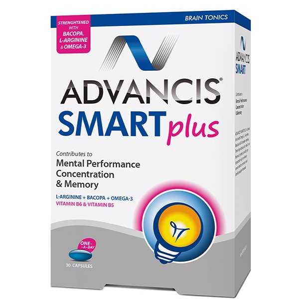 0Advancis® Smart Plus is a brain tonic designed to strengthen cognitive capacities, boost intellectual performance, improve concentrating and memorizing. It is a substantial help at times of high intellectual demand (e.g., study and test periods) and in the reinforcement of cognitive function in adults, and the elderly.